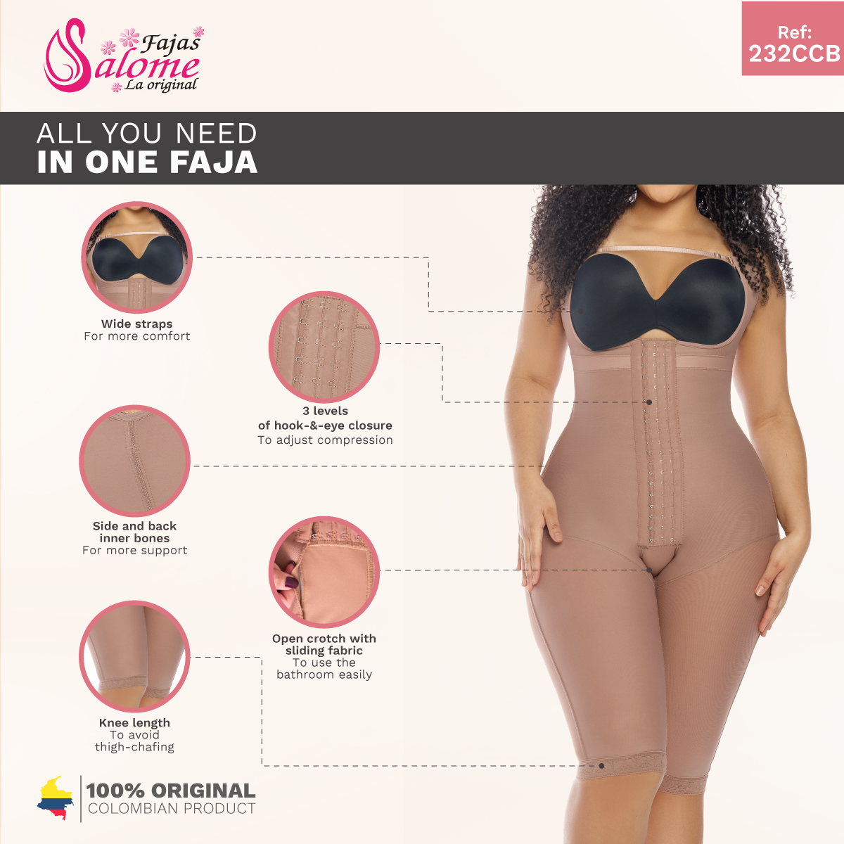 Get ready to shape your body with Salome 232-CCB Colombian Body Shaper. Its powerful fabric provides an unbeatable combination of shaping and compression tech to the upper, middle, and lower abdomen. Our shapewear will also effectively conceal back fat due to its high coverage – plus, it's recommended for post-operative recovery, postpartum, or daily use.